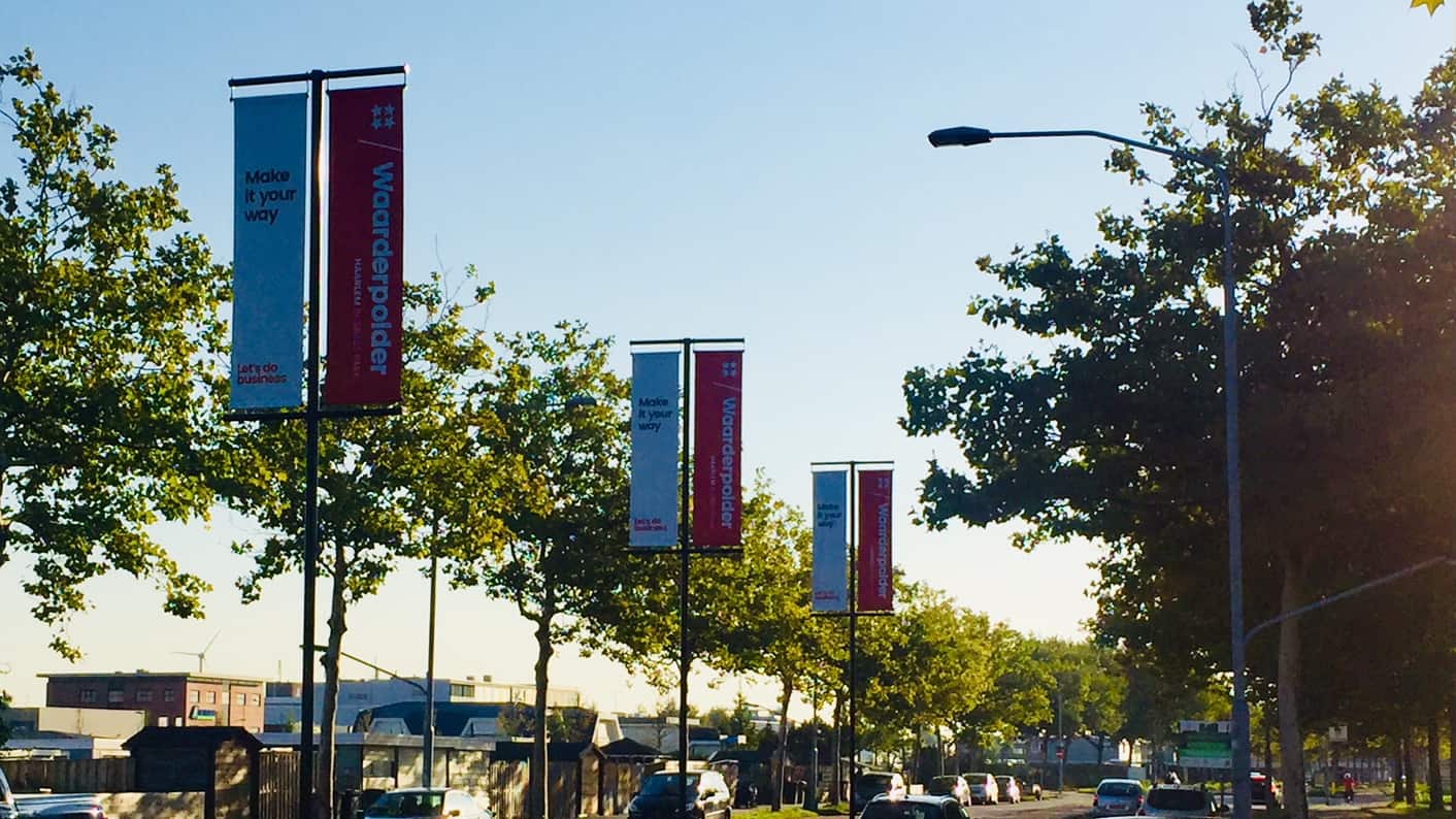 Bij de vier toegangswegen tot de Waarderpolder (Oudeweg, Schoterbrug, Fly-over N200 en de Industrieweg) staan al een hele tijd baniermasten. De banieren hebben in september een week de toegangswegen opgesierd. Een van de masten bij de Schoterbrug bleek echter al onvoldoende verankerd en is bij harde wind omgewaaid. Met de leverancier is lang overlegd en gezocht naar een oplossing hiervoor, waarbij veiligheid voorop staat.