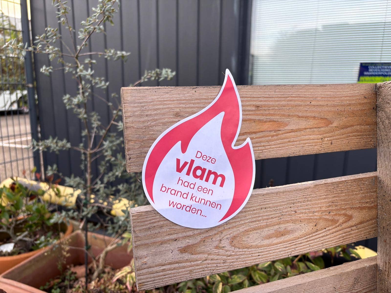 Brandbaar materiaal aangetroffen? De surveillance markeert het materiaal met een speciaal ‘vlammetje’ – een opvallende sticker. Daarnaast ontvang je een flyer met uitleg en praktisch advies om brandgevaar te voorkomen.