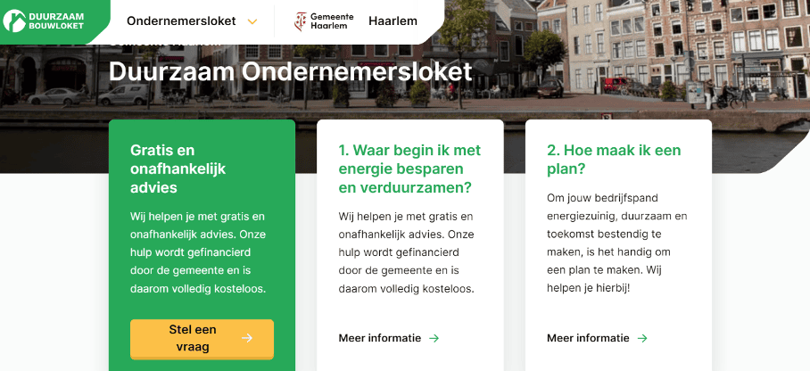 De gemeente Haarlem heeft een digitaal informatieloket opgezet voor alle Haarlemse ondernemers en instellingen die hun pand willen verduurzamen. Je vindt hier onder andere tips over energiebesparende maatregelen, informatie over subsidie- en ondersteuningsmaatregelen en hulp bij het opstellen van een verduurzamingsplan. Kijk voor meer info op: Gemeente Haarlem (duurzaambouwloket.nl).