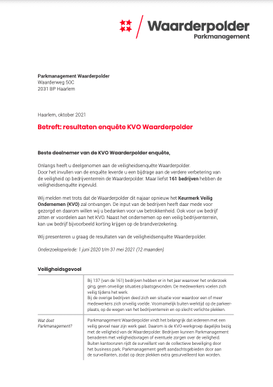 Daarnaast kunnen we met trots melden dat de Waarderpolder dit jaar opnieuw het Keurmerk Veilig Ondernemen (KVO) ontvangt. De input van de deelnemende bedrijven heeft daar mede voor gezorgd.