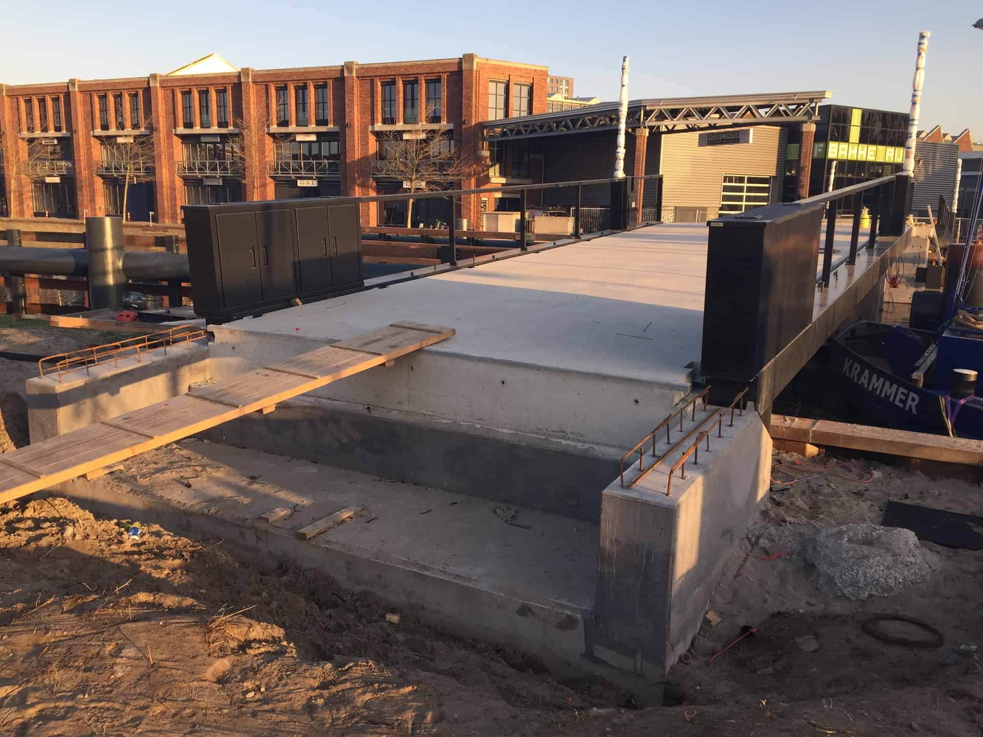 Vorige week zijn de randelementen en het leuningwerk op de aanbruggen aangebracht. Deze week wordt de hameitoren -de verticale draagconstructie waarop het beweegbare brugdeel draait- met een kraan vanaf het land geplaatst, waarna zaterdag 5 en zondag 6 mei het beweegbare brugdeel (het val) en de balanspriem worden geplaatst.