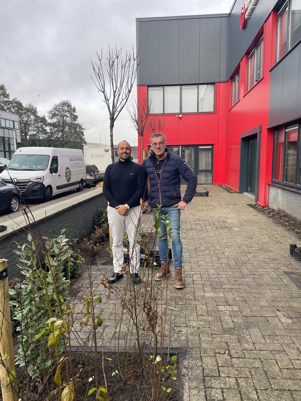 Op de foto staan Harold van Haren namens Geotech en hovenier Arjan Balkenende. Het planten van een haag was onderdeel van een totale renovatie van de buitenruimte van Geotech, waarbij ook enkele bomen zijn geplant.