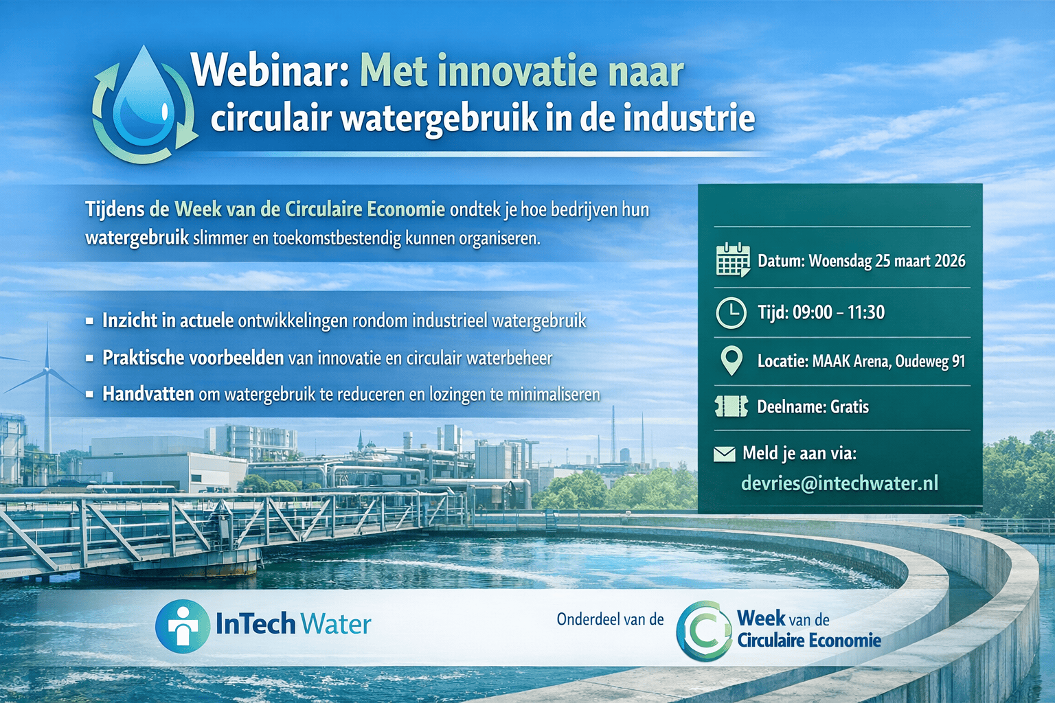 Tijdens dit gratis webinar duik je met InTech Water in de nieuwste ontwikkelingen rondom circulair watergebruik en krijg je tips om je bedrijf toekomstbestendig te maken. Met stijgende kosten voor water, strengere regelgeving en de impact van klimaatverandering is grip op water cruciaal.